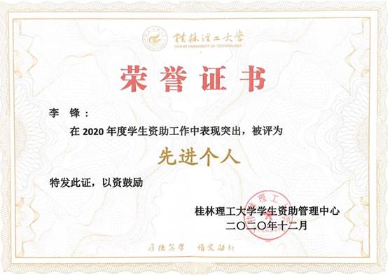12月16日,桂林理工大学在雁山校区图书馆报告厅召开了“2020年学生资助工作总结暨表彰大会”。我院被授予“桂林理工大学2020年度学生资助工作先进集体”荣誉称号,2019级辅导员李锋老师被评为“桂林理工大学2020年度学生资助工作先进个人”。