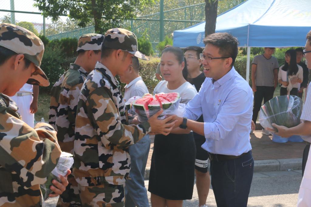 学院党委书记耿俊茂对承训教官在军训期间克服高温天气,坚持高标准训练予以充分肯定,对坚守岗位、奋斗在一线的大学生军训团成员和辅导员表示感谢。此外,学院师生党员们带来了西瓜,慰问全体参训人员,在酷暑中为大家带来了凉爽。