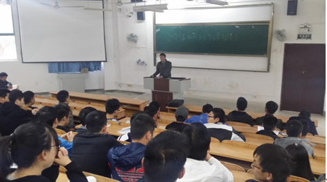 图为代宣军老师在做2018届机械专业毕业实习动员大会