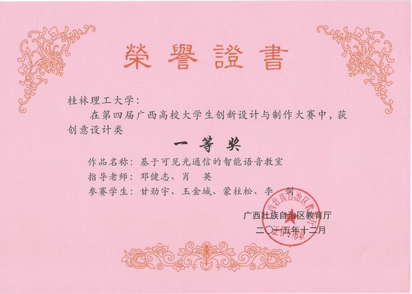 11月中旬,由广西壮族自治区教育厅主办,桂林电子科技大学承办的第四届广西高校大学生创新设计与制作大赛在桂林电子科技大学体育馆落下帷幕。本届比赛共有全区32个高校代表队的284件参赛作品参与了大赛角逐。机械与控制工程学院组队代表我校参加了此次大赛。经过专家的认真评审,我校参赛代表队共获得3个一等奖,4个二等奖和2个三等奖,并获得本届大赛的优秀组织奖。(其中:A组机械制作类获一等奖1个,二等奖3个;B组机电结合类获一等奖1个,二等奖1个,三等奖2个;C组创意设计类获一等奖1个。)