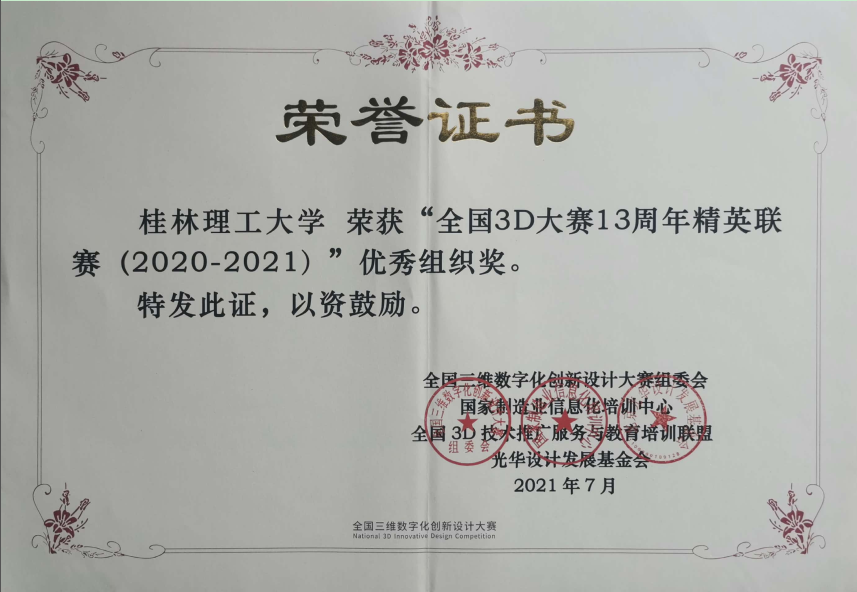近日,全国三维数字化创新设计大赛13周年精英联赛全国总决赛落下帷幕,结合当前疫情防控形势,总决赛采用了线上为主的方式进行,全国总共有389所高校共有5556支队伍参赛,我校以机械与控制工程学院师生为主的代表队参加了该项赛事,参赛队喜获全国一等奖1项、二等奖2项、三等奖5项,广西赛区特等奖8项、一等奖9项、二等奖19项、三等奖8项。同时,我校荣获全国3D大赛13周年精英联赛优秀组织奖。