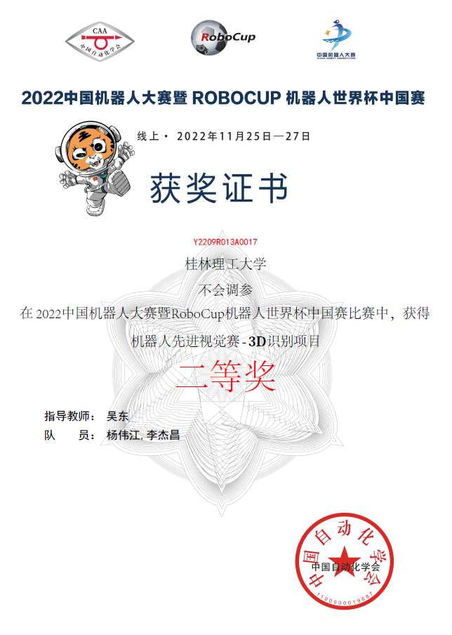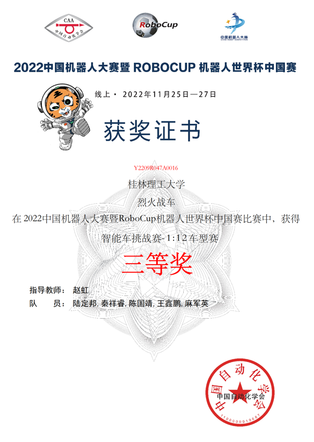 近日,2022年中国机器人大赛暨RoboCup机器人世界杯中国赛获奖结果揭晓。经过激烈角逐,我校机械与控制工程学院学子李杰昌、杨伟江团队(指导教师:吴东)荣获机器人先进视觉赛—3D识别项目全国二等奖,陆定邦、秦祥睿、陈国靖、王鑫鹏、麻军英团队(指导教师:赵虹)荣获智能车挑战赛—1:12车型赛全国三等奖,王英超、包盛宝、李松霖团队(指导教师:王文成)荣获助老服务机器人—助老环境与安全服务项目全国三等奖。我校学子首次参加中国机器人大赛暨RoboCup机器人世界杯中国赛,最终获得全国二等1项、全国三等奖2项的好成绩。