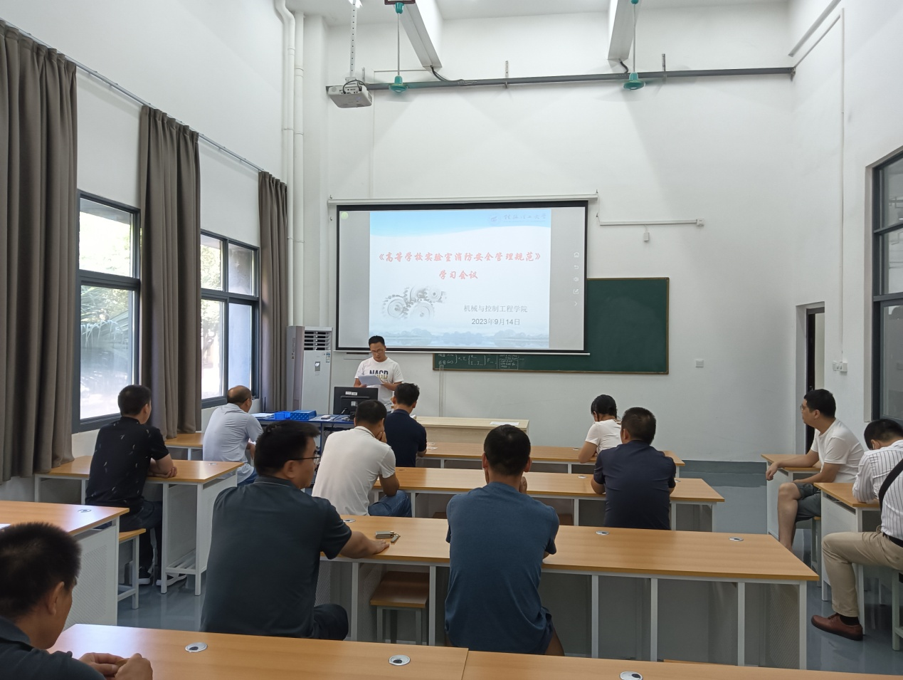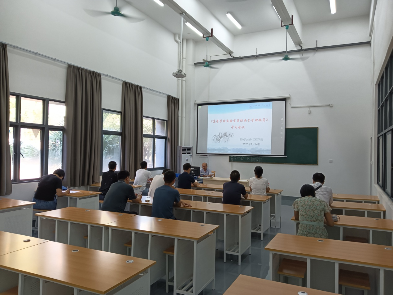 9月14日中午,机电工程实验中心在13栋金工中心一楼会议室开展《高等学校实验室消防安全管理规范》学习会议,实验中心全体教师参加了本次会议,会议从消防安全责任、消防安全制度和管理、消防安全措施展开学习。学院安全员杨亮亮老师组织学习JYT0616—2023《高等学校实验室消防安全管理规范》。要求各位老师要提高思想认识,增强做好实验室消防安全管理工作的责任感,要强化责任落实,扎实落实消防安全管理工作;认真学习规范,对自己管理的实验室开展消防安全隐患的排查整治,确保实践教学过程的安全开展。