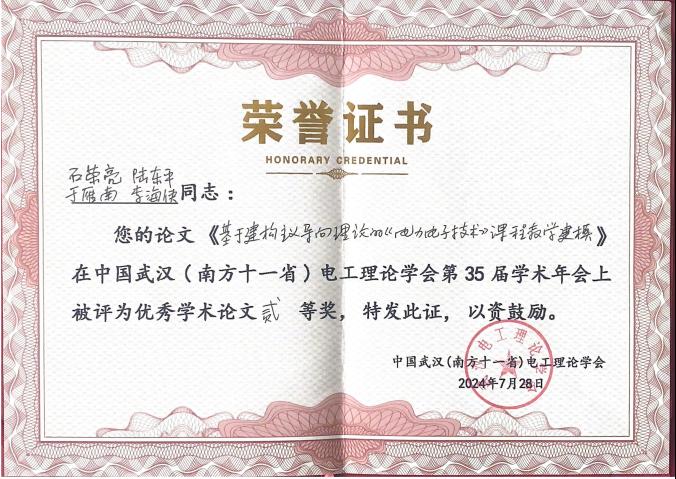 【绿色发展·榜样领航】学院教师在中国武汉(南方十一省)电工理论学会第35届学术年会中喜获优秀论文二等奖