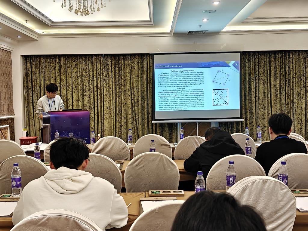 29日下午的分会场学术汇报中,我院教师孙旋以及5名硕士研究生通过技术创新与工程实践的结合,展现了他们在学科交叉领域的探索活力。孙旋以《Multi-objective Optimization Design of the Hinge Sleeve of Cubic》为题,分享了立方体铰链套的多目标优化设计方法,为复杂机械结构的轻量化设计提供了新思路;机械工程专业研究生李有兵作了题为《Decoupling Control of Electromagnetic Bearing Rigid Rotor System Based on IGWO and Linear Active Disturbance Rejection Inverse System》的报告,提出了一种新型复合的控制策略应用在电磁轴承系统中;电子信息专业研究生李纪臻作了题为《Research on sea surface Gimbal Control Strategy Based on LESO Observation PID》的报告,提出了海洋环境下云台姿态稳定控制新方法;电子信息专业研究生张佳强作了题为《Improved YOLOv8 Algorithm for Indoor Object Detection》的报告,分享了强化学习在工业机器人领域的应用突破;电子信息专业研究生杨振作了题为《Analysis of Arc-Extinguishing Performance of C4F7N/CO2 Gas Mixtures in Multi-Chamber Systems Under Impulse Current Conditions》的报告,为高压电力装备的绝缘介质选择提供关键实验依据。电子信息专业研究生张宝桐作了题为《Improved YOLOv8 Algorithm for Indoor Object Detection》的报告,为服务机器人环境感知提供了新思路。