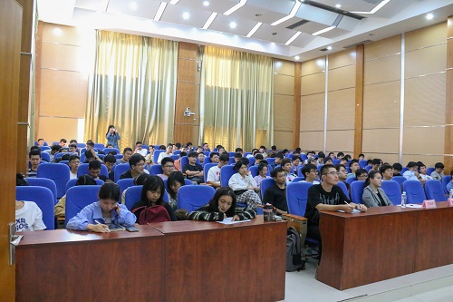 讲座开始,于雁南副院长首先欢迎优秀校友回校给学生做报告,同时她向在座的研究生介绍梁教授的求学经历和学术成就,并提倡研究生珍惜机会与学长交流。随后,梁老师通过一些老照片开启了在桂工求学的记忆,也拉近了与学生们之间的距离。紧接着他从研究背景入手,讲述了自己的科研方向——纳米材料连接技术的相关研究,通过纳米科学与纳米技术的研究案例,向大家展示了科学研究方法中“自上而下”和“自下而上”的异同,随后他分享了自身的求学经历和做科研的思路方法,从小的细节寻找科研的灵感,即通过细心的观察,不断的模拟实验,推导并预测了纳米线断裂模式的数学模型。梁老师告诫大家要善于观察、分析生活中的现象,还分享了自身在撰写论文和投稿过程中的一些具体做法和深度思考。最后,他向大家展示了博士论文和博士后论文的选题和内容,让在座的研究生们赞叹不已。