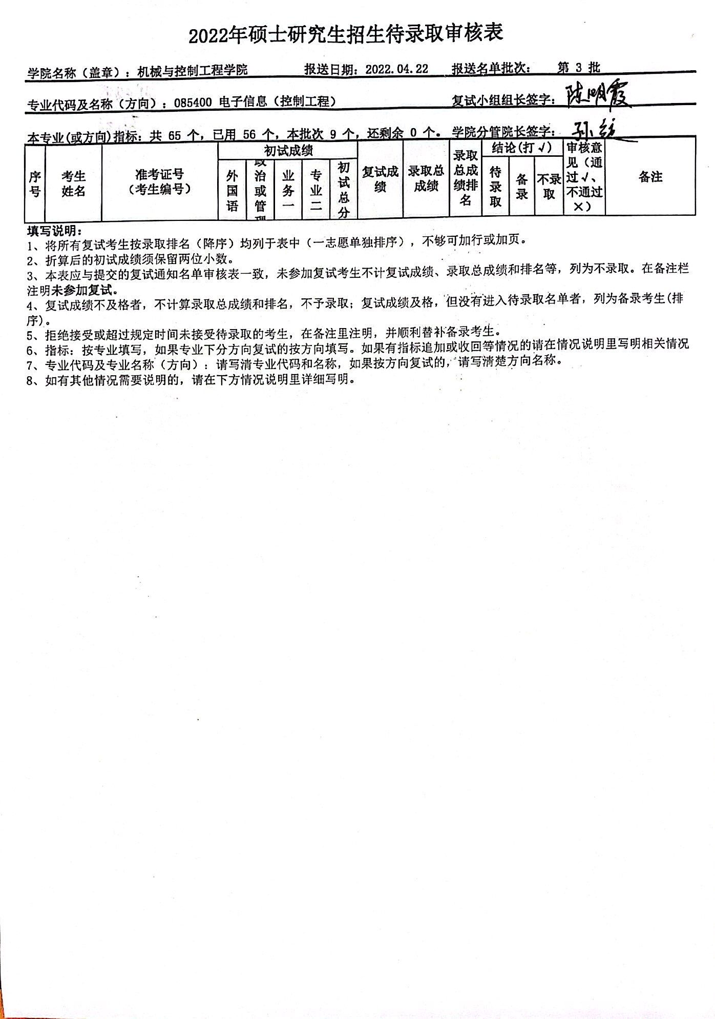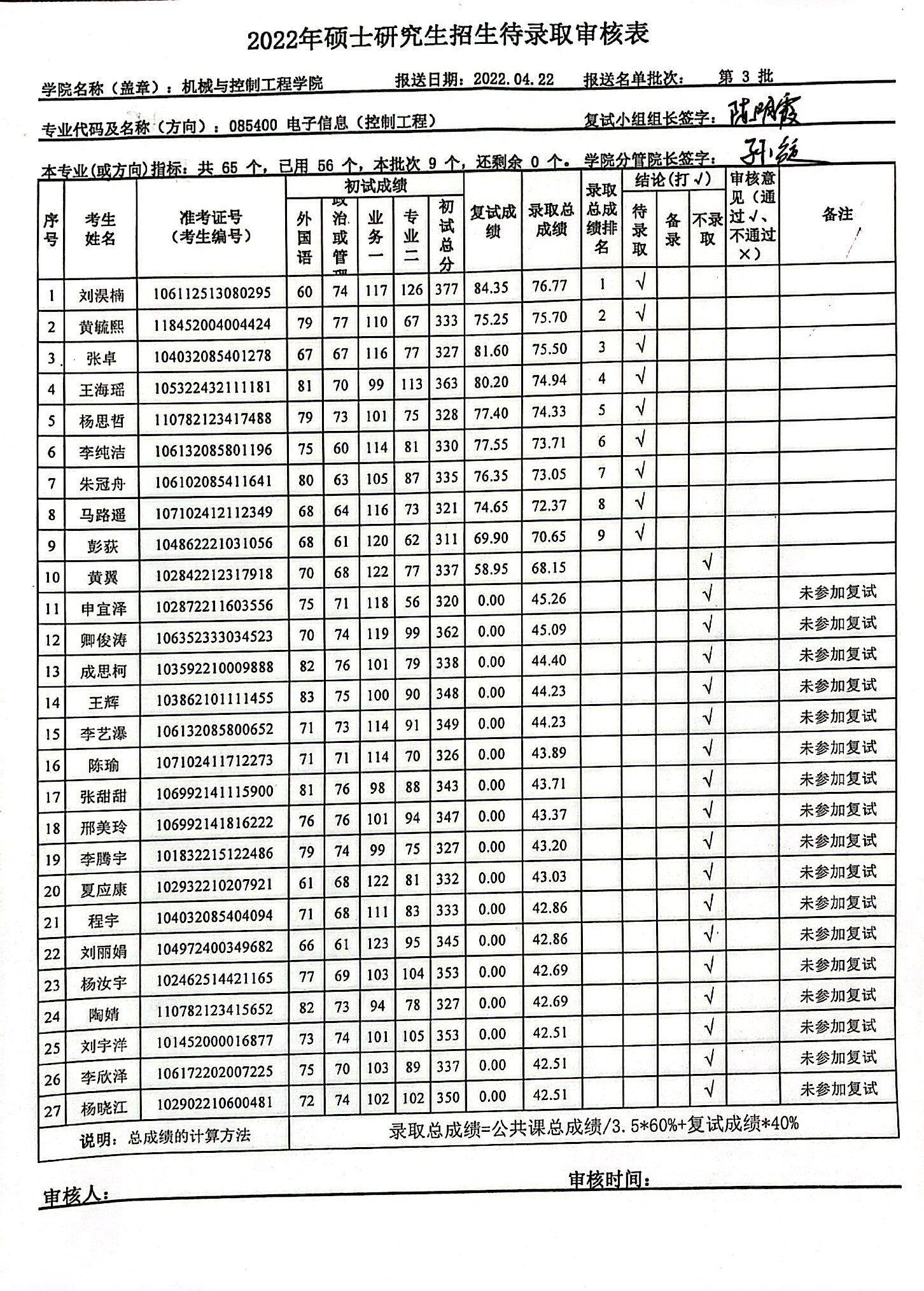 2022年开云官方端网站登录入口研究生招生电子信息(控制工程)调剂复试待录取学生名单
