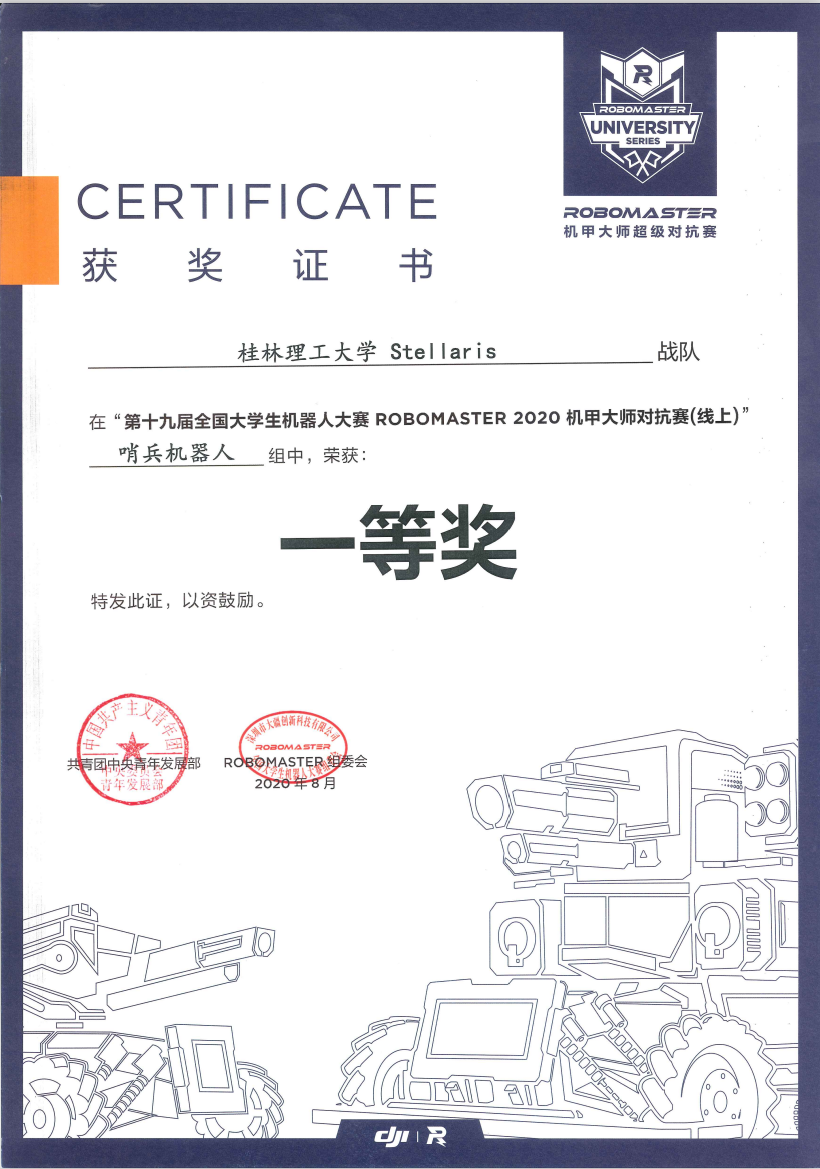 但是,在如此艰难的情况下,Stellaris战队的参赛热情并未受到影响。经过一年的辛苦备战,在秦建华,张声岚,韦建豪,周卢婧,黄鹏等老师的指导下,Stellaris战队不畏艰险,成功夺得第十九届全国大学生机器人大赛RoboMaster 2020机甲大师赛(线上)一等奖一项,二等奖两项,三等奖四项的好成绩,具体获奖情况如下: