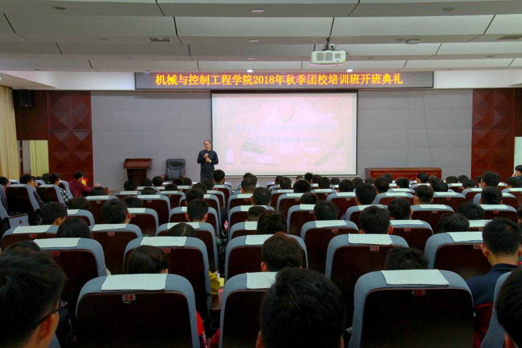 20181024日晚,机械与控制工程学院于一栋报告厅01501召开了2018年秋季团校培训开班典礼,出席本次开班典礼的有院党委副书记耿俊茂,学院团委书记刘颖洁、团委学生会全体学生干部以及各年级班委;学院易班新媒体中心、机器人基地、科技协会、心理协会、扬爱协会等组织学生干部,共计160余人。开班典礼在中国共青团团歌的全体奏唱下召开.
