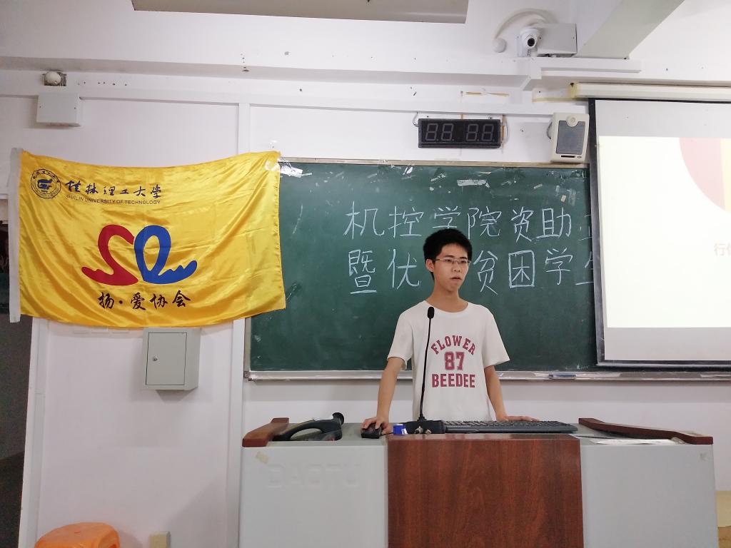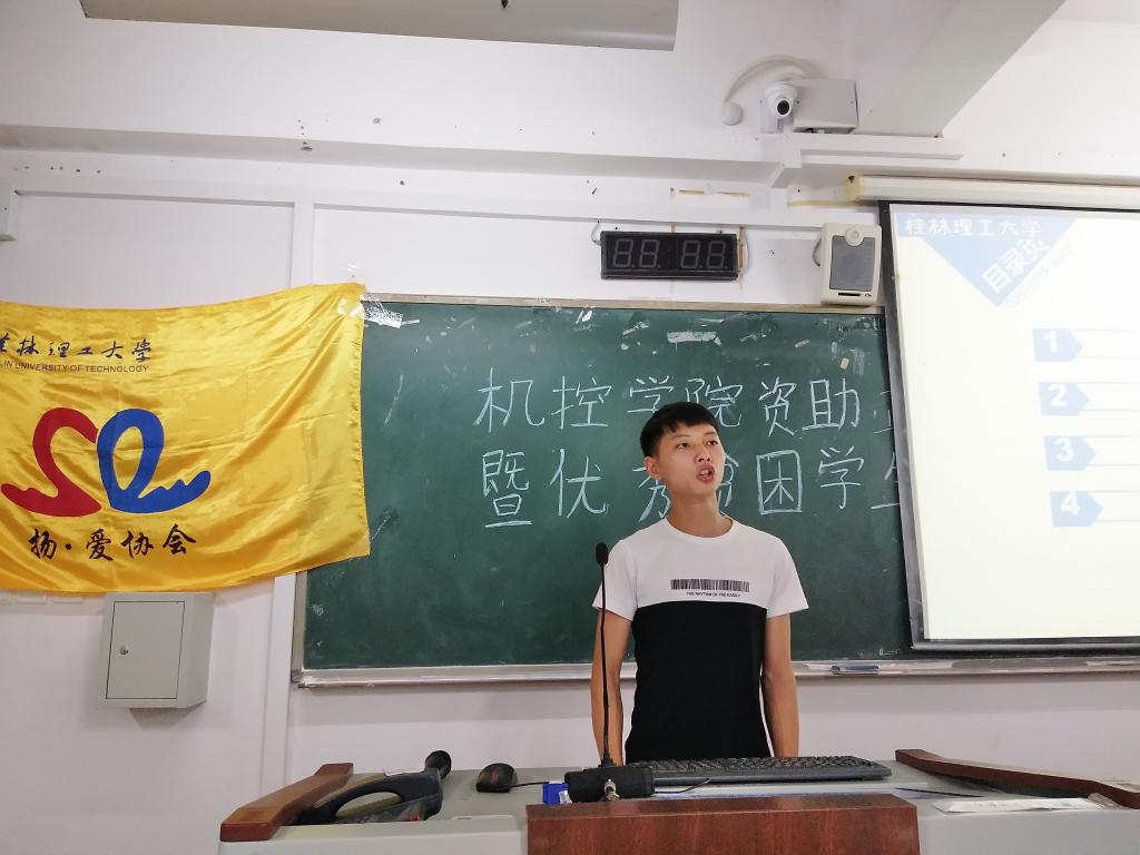 首先,刘金良老师对本次活动致辞,说明本次活动的目的与意义,希望同学们能怀有一颗感恩的心,勇敢在大学追逐自己的梦想,实现人生价值。接着,刘金良老师给本次资助月征文比赛获奖同学进行颁奖,扬•爱协会会长韦武谭给学院自强之星和公益摄影大赛进行了颁奖。最后,学院优秀贫困生代表曾德政、韦雄棉、王舟等同学进行报告,分享大学的学习、工作、科技竞赛、考研、生活等方面的经验,鼓励大家一起进步,不断提升自己,让自己越来越优秀,让自己的大学生活绽放光彩。