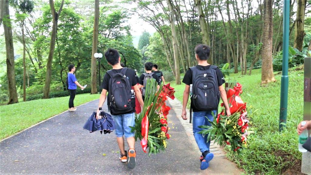 实践队成员提着沉甸甸的花篮盘旋上山
