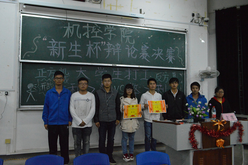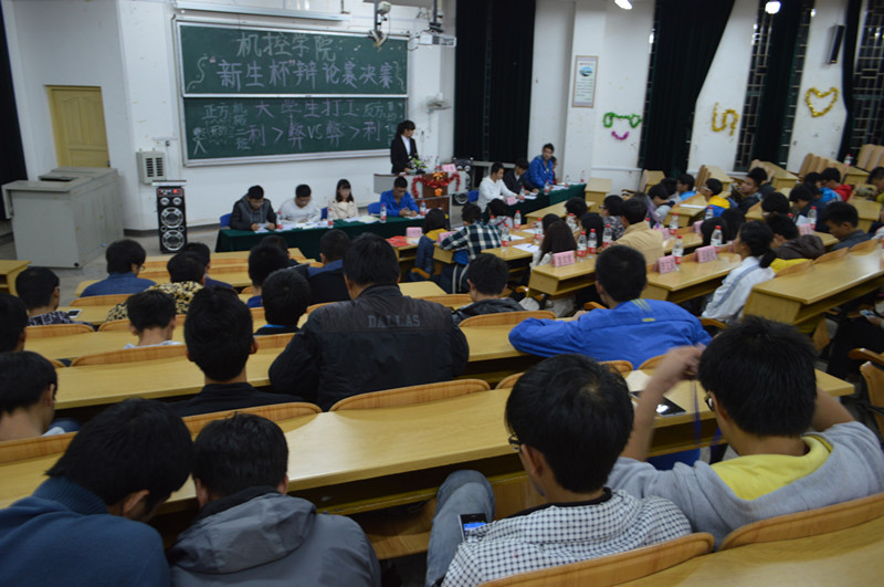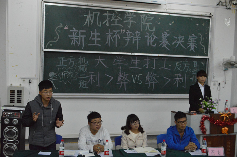 本场辩论赛的正方为机械14-2班,反方是自动化14-1班。双方就“大学生打工利与弊”展开了激烈的辩论。正方认为大学生打工利大于弊,既可以减轻家庭负担,又能丰富社会经验,更能为以后工作奠定基础,更重要的是还能提升个人的综合能力;反方则觉得大学生打工弊大于利,大学生主要任务是学习,打工不但会影响到学习,而且存在相当大的安全隐患。正反双方针锋相对,你来我往,赢得了现场观众的阵阵掌声。最后,正反赢得了本场比赛的胜利,正方三辩获得了最佳辩手称号。