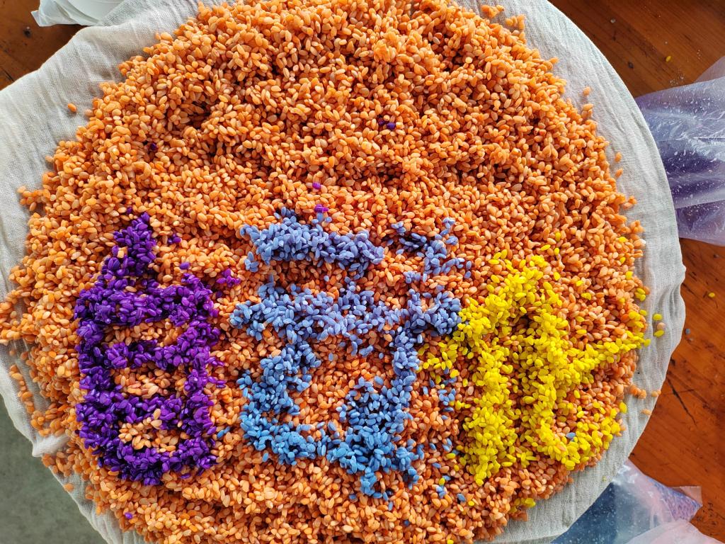 “五彩糯米饭”是壮族地区的传统风味小吃。因糯米饭呈5 种色彩而得名。每年农历 " 三月三 "、清明等节日,壮族群众都喜欢制作 " 五彩糯米饭 "。将糯米放入用红蓝草、黄饭花、枫树叶、洛神花等提取的对人体有益无害的彩色汁液染色,做成五种颜色,再放入蒸笼中蒸熟,艳丽多彩、清香四溢,别有风味。参加活动团员青年共同制作了“五彩糯米饭”,活动现场大家利用颜色不同的米饭进行“作画”,将糯米饭拼出“中国地图”、“自动化”等不同图案,展现了民族的文化魅力。团员青年还深入村民家中向各族人民分享了自制的彩色糯米饭和宣传了民风民俗。