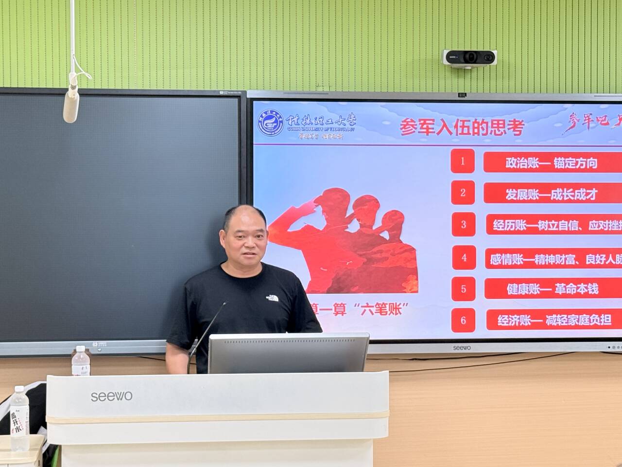 会上,黄海老师从国家国防建设与人才培养战略的全局角度出发,以严谨科学的视角,系统剖析了征兵入伍的全流程。他针对应征入伍的基本条件、规范的报名流程、严格的体格检查标准以及政治考核的关键要点等核心环节,逐一进行解析与精准阐释,确保在场学生对入伍的前置环节形成清晰、准确的认知。