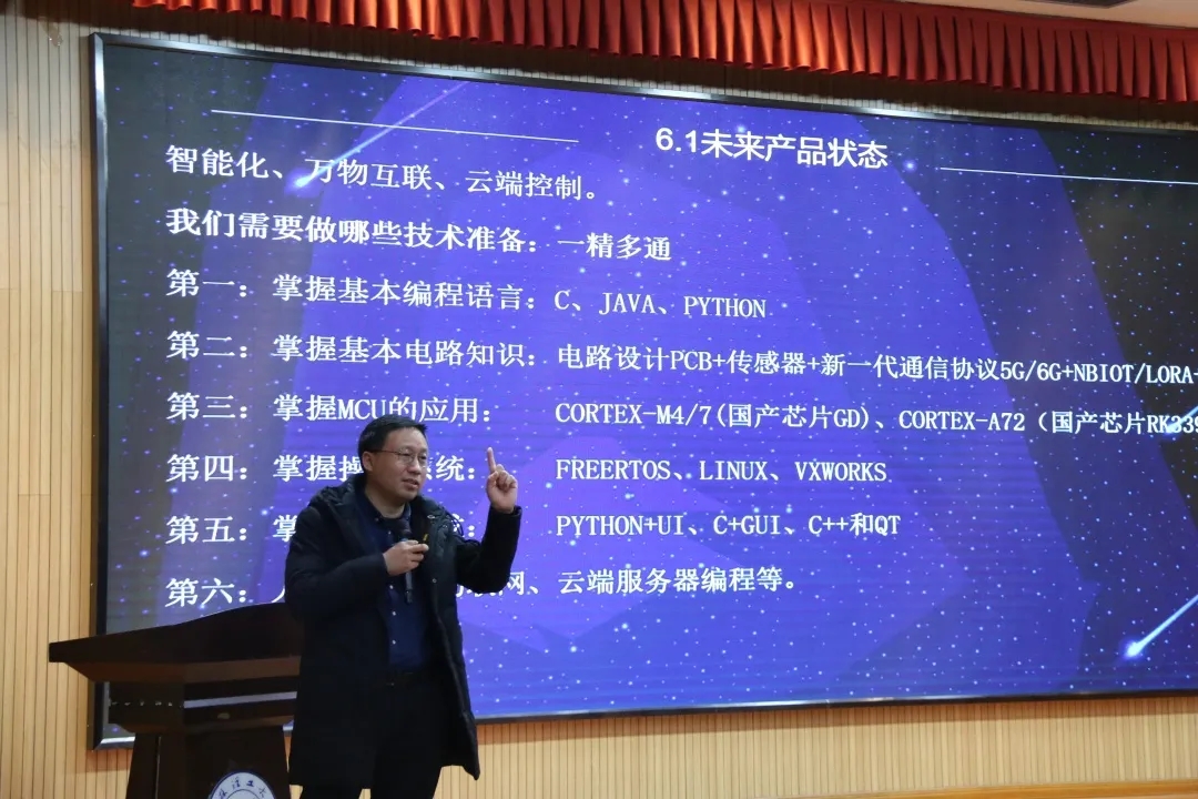 最后,牛乐乐董事长进行了精彩的嵌入式AI+5G前沿技术讲座。牛董事长在讲座中展示了基于5G+AI云技术对互联网应用的影响,强调了学好计算机对同学们未来职业生涯的重要性,向同学们传递人机合一、万物联网的观念。并在最后劝诫同学们:时机到来,有能力才能抓住机会;时机到来,有团队才能让你勇往直前;时机到来,有强大执行力,才能获得巨大成功!