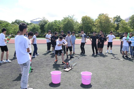 青春激昂,热情飞扬。即使天气炎热,艳阳高照,依旧不能阻挡我们参赛的热情。比赛还未开始,参赛选手们就提前到达了现场,可见他们已经迫不及待想要让自己的水火箭飞上蓝天了。一飞冲天,精彩瞬间。你以为这就结束了吗?不,这只是刚开始。