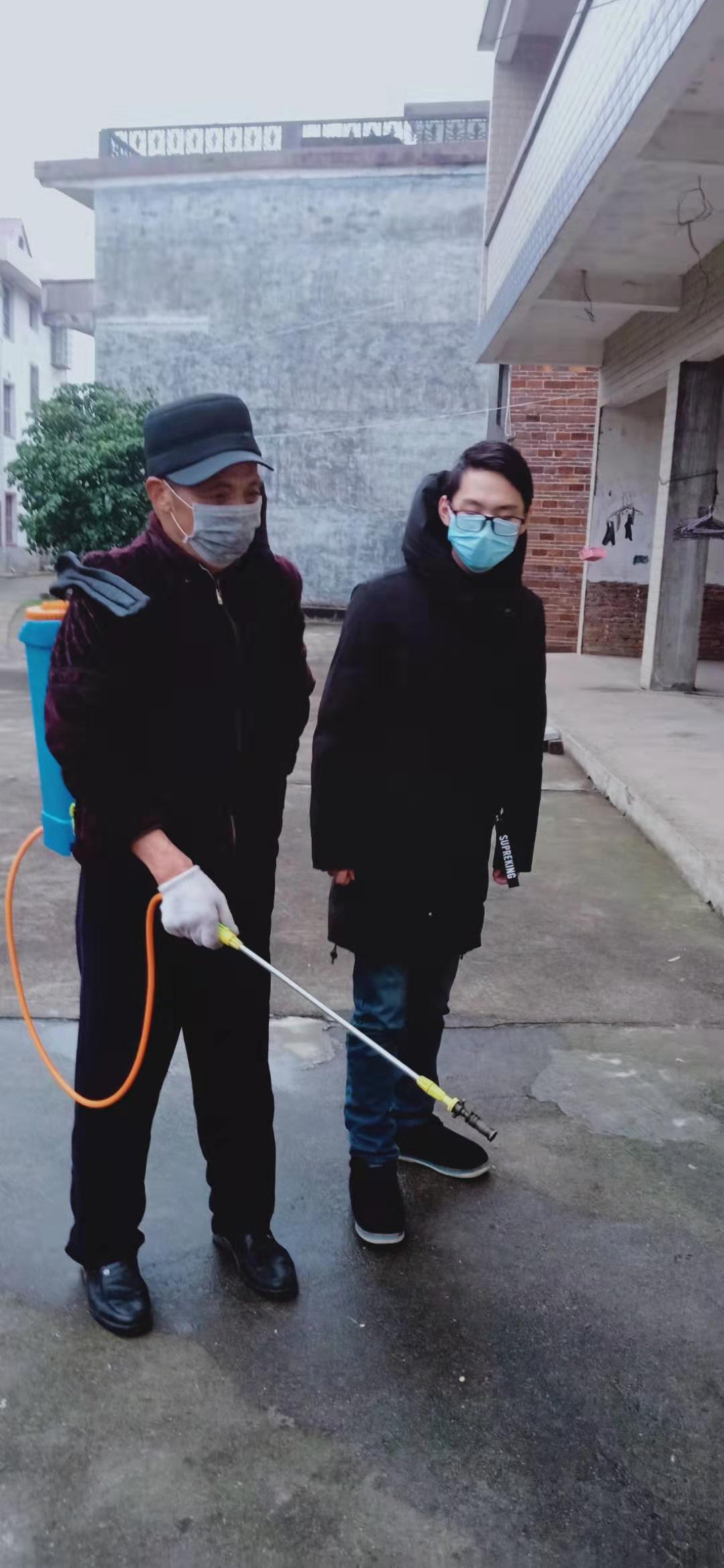 (罗佳豪在村里协助消毒)