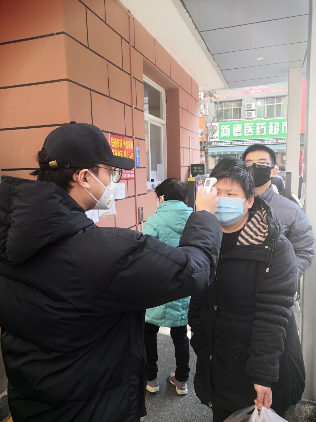 (魏俊涛在社区路口测量体温)